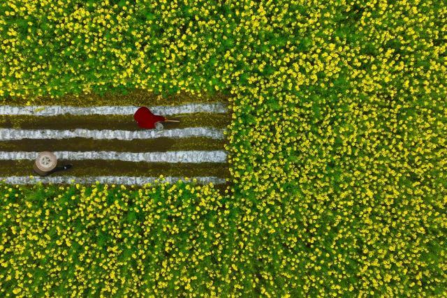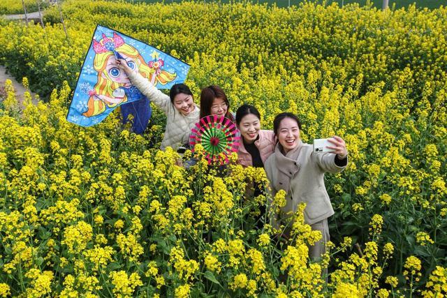 3月26日,河南省焦作市博爱县金城乡韩庄村,游客在油菜花旁拍照打卡。新华社发(程全摄)