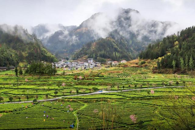3月22日,游人在安徽省黄山市歙县霞坑镇石潭村春游赏花(无人机照片)。新华社发(樊成柱摄)