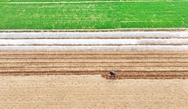 3月23日,山东省临沂市郯城县郯城街道,农民在田间劳作(无人机照片)。新华社发(张春雷摄)