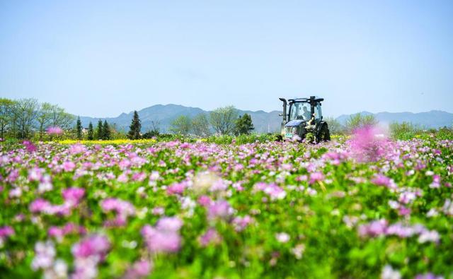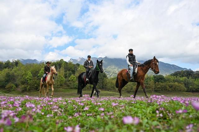 3月26日,游客在重庆市武隆区石桥苗族土家族乡八角村紫云英花海中骑马。新华社记者 陈诚 摄