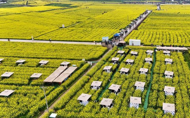 3月12日,游客乘船驶过重庆潼南崇龛花海景区(无人机照片)。新华社记者 王全超 摄