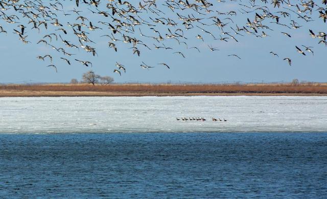 这是3月23日在松花江佳木斯段拍摄的大雁群。新华社发(陈志国摄)