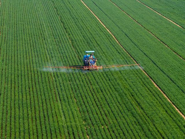 3月10日,农民在江苏里下河地区农科所(扬州市农科院)的麦田间喷洒农药(无人机照片)。新华社发(孟德龙摄)